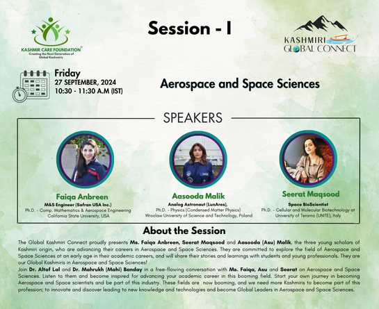 The Global Kashmiri Connect proudly presents Ms. Faiqa Anbreen, Seerat Maqsood, and Malik Aasooda (Asu), three young scholars of Kashmiri origin, who are advancing their careers in Aerospace and Space Sciences. They are committed to exploring these fields early in their academic careers and will share their stories and learnings with students and young professionals. They are our Global Kashmiris in Aerospace and Space Sciences!